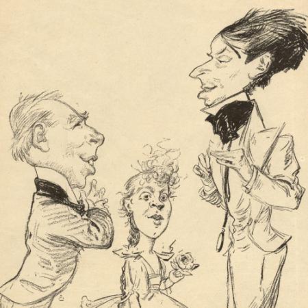 Les caricaturistes croquent aussi bien les caractéristiques physiques des auteurs, que leurs personnalités littéraires. Le portrait-charge se fait plus mélancolique à l’orée du XXe siècle, sous la plume de Sem, illustrateur et chroniqueur de la vie mondaine qui s’attache particulièrement à peindre les milieux littéraires et artistiques de son époque.